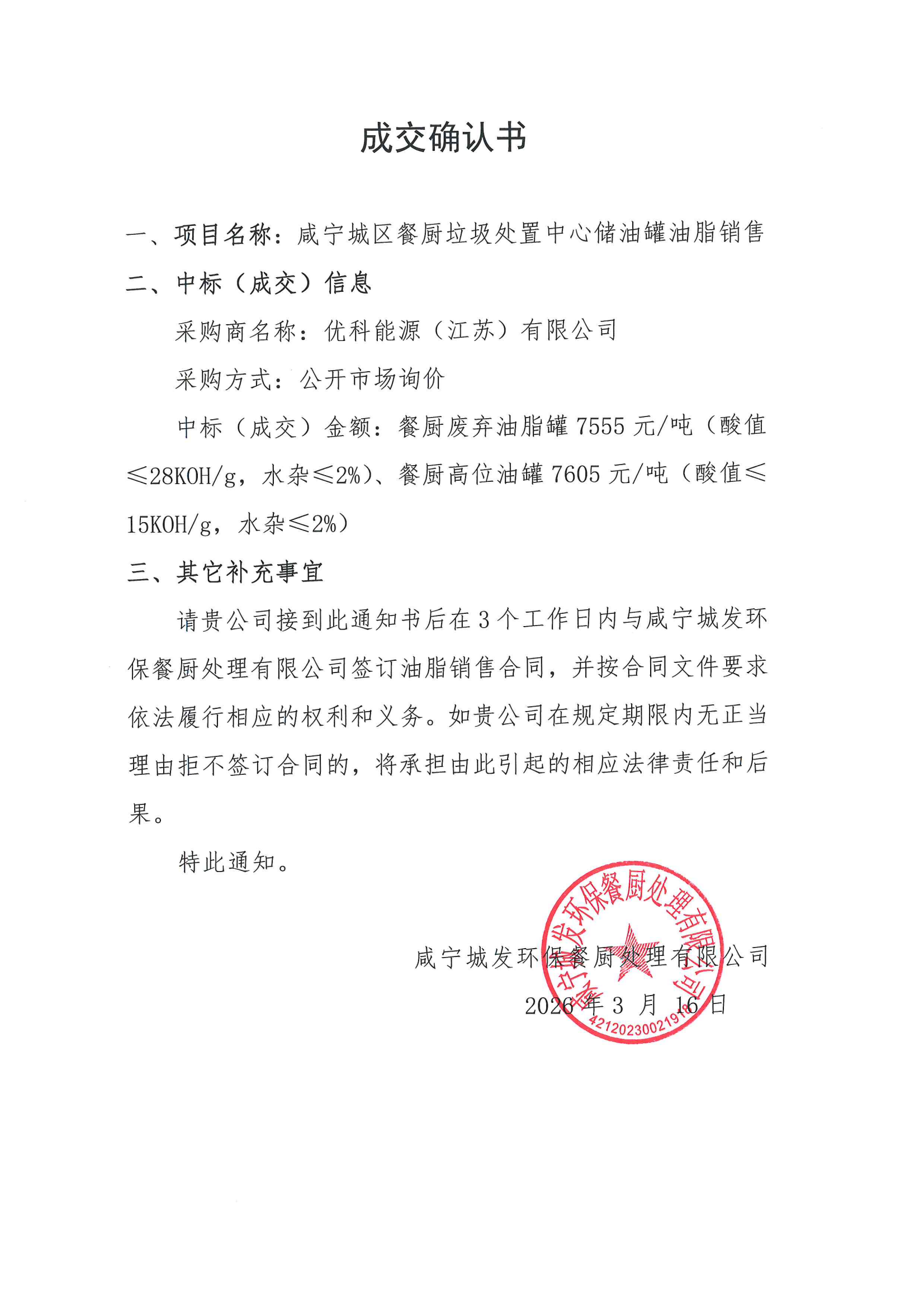 2026年3月餐廚集中化項(xiàng)目廢棄油脂銷售成交確認(rèn)書